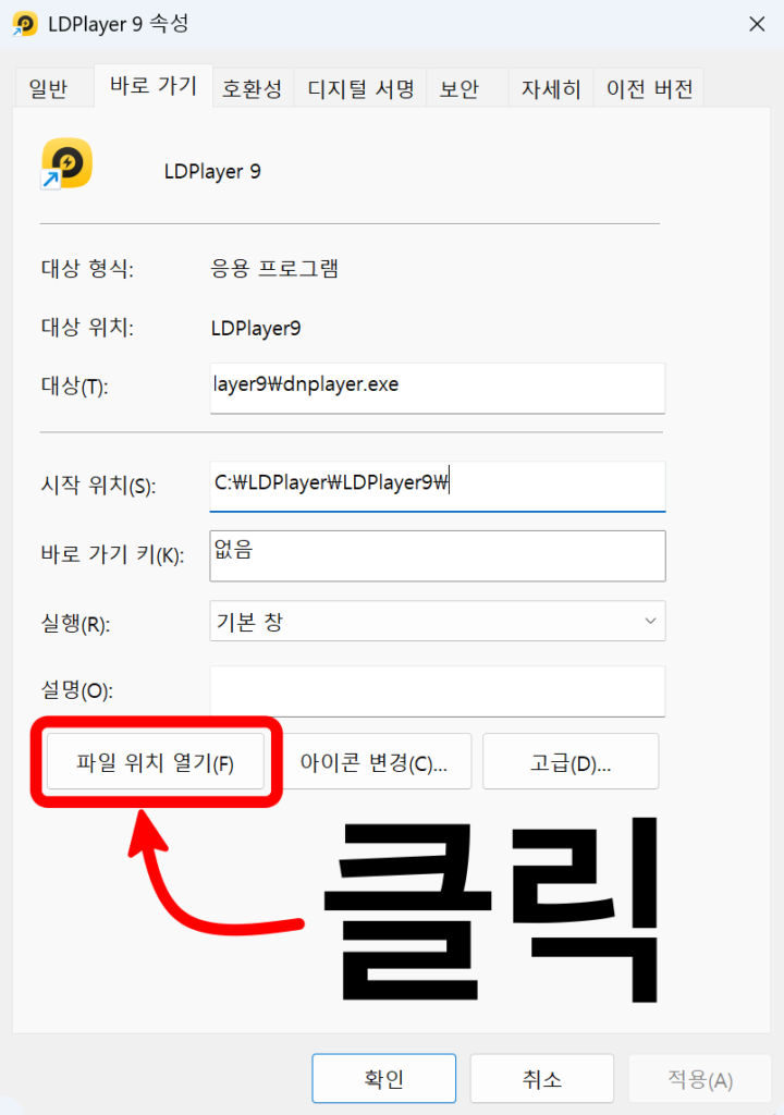 엘디플레이어 속성창이 열리면 “파일 위치 열기” 버튼 클릭