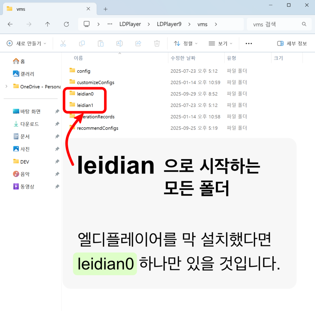 ⚠️ 새로운 컴퓨터에 LDPlayer를 새로 설치한 경우, 기본적으로 leidian0 폴더만 생성되어 있습니다.