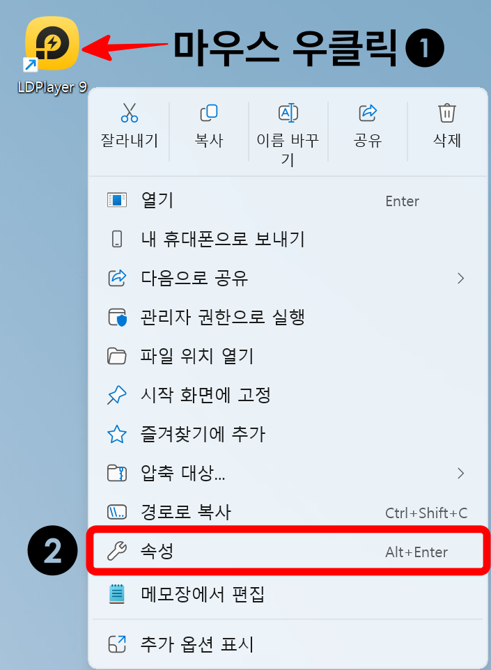 기존에 봇을 세팅해 사용하던 PC의 바탕화면에서 LD Player9 바로가기 아이콘에 마우스를 위치시키고 우클릭 후 속성 메뉴 클릭