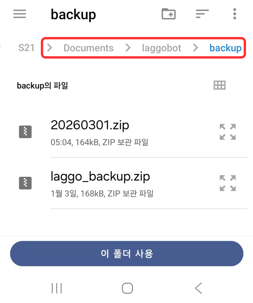 📍폰/태블릿 유저 : Documents → laggobot → backup