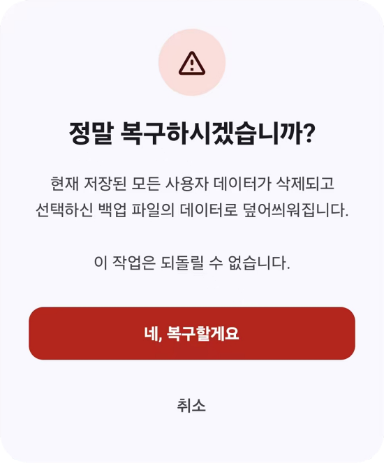 5️⃣ 데이터 복구하기 버튼을 누르면 최종 확인창이 뜹니다. 빨간 버튼을 누르시면 선택하신 파일로 복구가 완료됩니다.