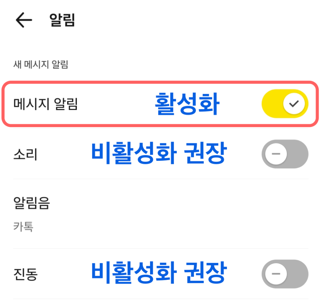 봇계정의 카톡에서 전체 설정 – 알림 에서 “메시지 알림” 을 비활성화 하시면 안 됩니다. 꼭 활성화 하세요.