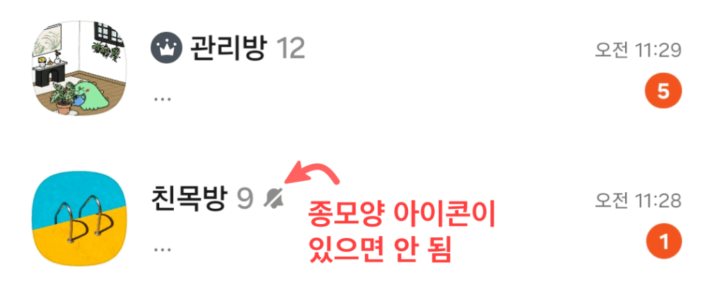 채팅방 알림은 꼭 켜두셔야 합니다. 채팅방 이름 우측에 종모양 아이콘이 떠있으면 안 됩니다.